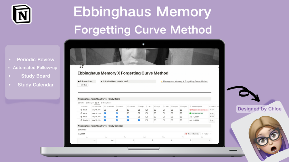 This template is designed to help you use the Ebbinghaus memory forgetting curve method for efficient learning and review. It includes multiple views and features to ensure that your study tasks are systematically managed and effectively executed.