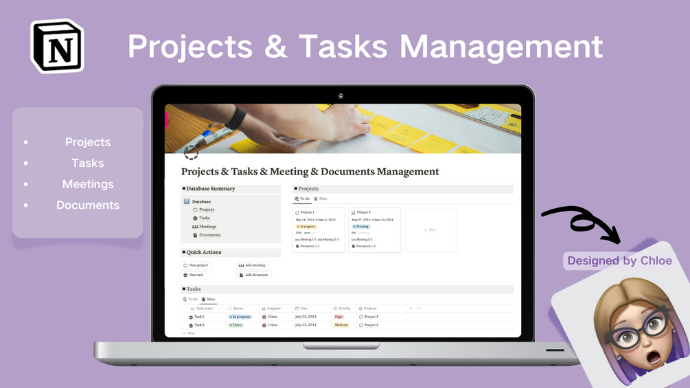 My newly designed Project Task Management template revolutionizes traditional project management by incorporating two additional modules: Meetings and Documents.
