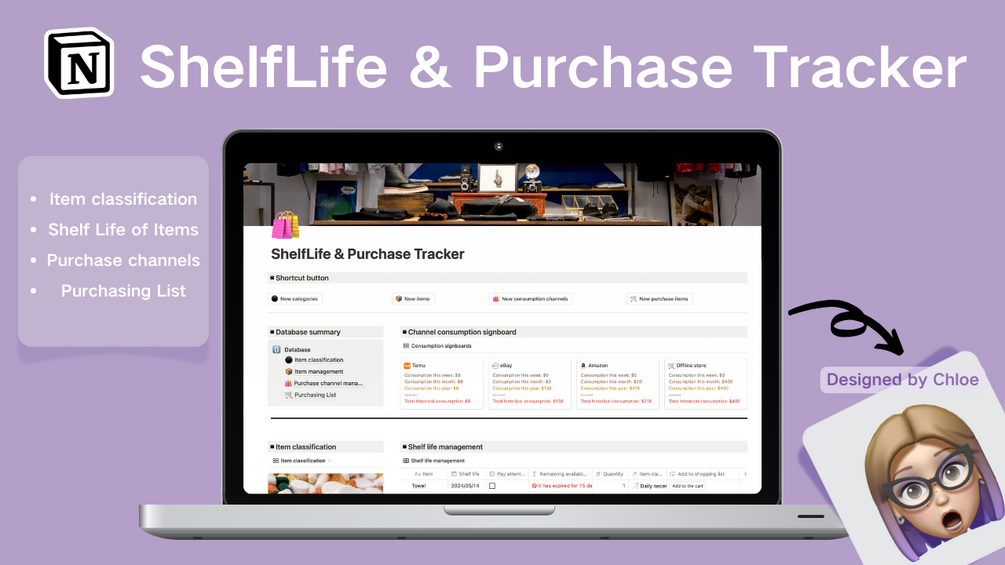 In this template, I've provided four modules to help you manage your items effectively. You can use these four modules to manage items and monitor their expiration dates, track your purchase records, develop good shopping habits, and eliminate waste.